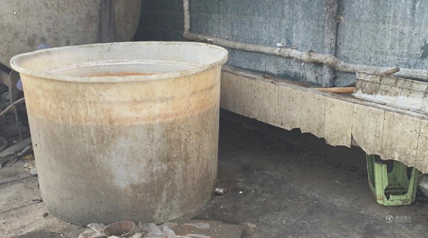 位于河南省通許縣工業(yè)園的開封勁松食品有限公司生產(chǎn)廠房內(nèi),運送辣條的藍色塑料箱上面布滿黑色的污物和油漬(3月7 日攝 視頻截圖)。