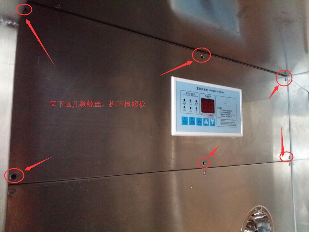 下面詳細(xì)的談一下整機(jī)發(fā)貨的風(fēng)淋室接電的正確方法之如何區(qū)分火線、地線和靈線:第一步:找到風(fēng)淋室顯示板,卸下螺絲,拆下檢修板(如下圖);