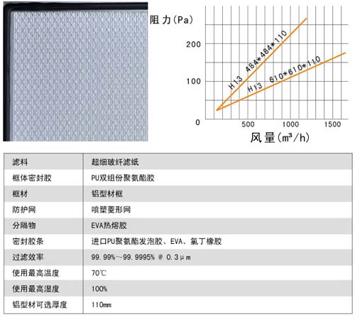 過濾效率:H13:99.97-99.99%@0.3μm H14:99.995-99.999%@0.3μm。