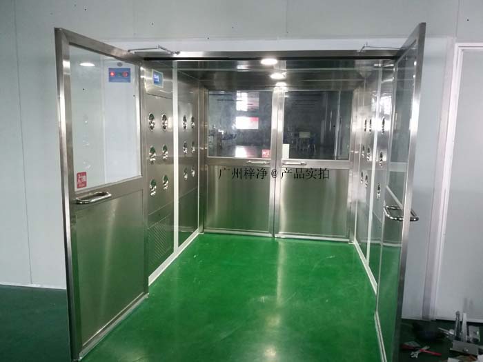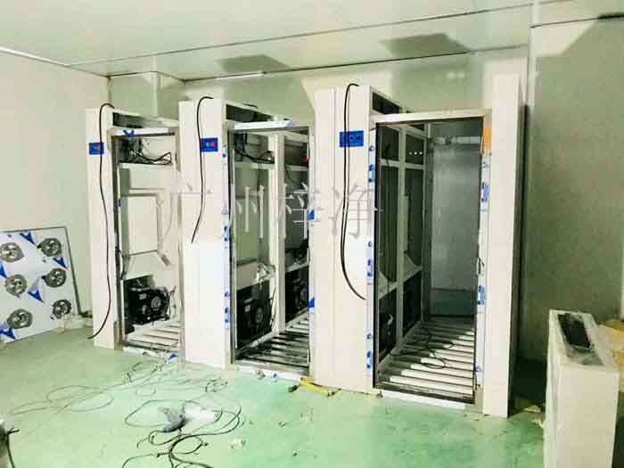 貨淋室是貨物進入潔凈室所必需的通道,它利用高速的潔凈氣流吹落并清除進入潔凈室人身服裝或物料表面上附著塵埃粒子。進出風(fēng)淋室的門是不能同時開啟的,可以兼起氣閥作用,防止外部空氣進入潔凈室,并使?jié)崈羰揖S持正壓狀態(tài);貨淋室經(jīng)高效過濾器過濾后的潔凈氣流由可旋轉(zhuǎn)噴嘴從各個方向噴射至貨物、人體上,有效而迅速清除塵埃粒子,再由初效過濾器、高效過濾器過濾后重新循環(huán)到風(fēng)淋區(qū)域內(nèi)。