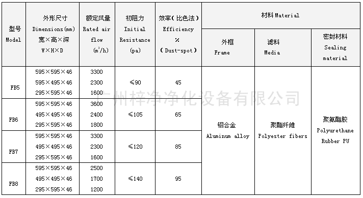 FB板式中效過濾器結(jié)構(gòu)堅固、外框采用鋁合金、聚酯纖維濾料、密封膠為聚氨酯膠PU。