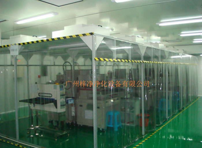 軟簾潔凈工作棚又稱為薄膜潔凈棚、軟簾凈化棚等,軟墻潔凈棚采用工業(yè)鋁材(或不銹鋼方通、鐵方通噴塑)作為框架,風(fēng)機(jī)濾網(wǎng)機(jī)組(FFU)送風(fēng),四周懸掛防靜電垂簾(或鋼化玻璃),其內(nèi)部?jī)艋?jí)別可達(dá)到100-10000級(jí)。軟簾潔凈工作棚適用于操作區(qū)內(nèi)局部?jī)艋?jí)別要求高的區(qū)域。