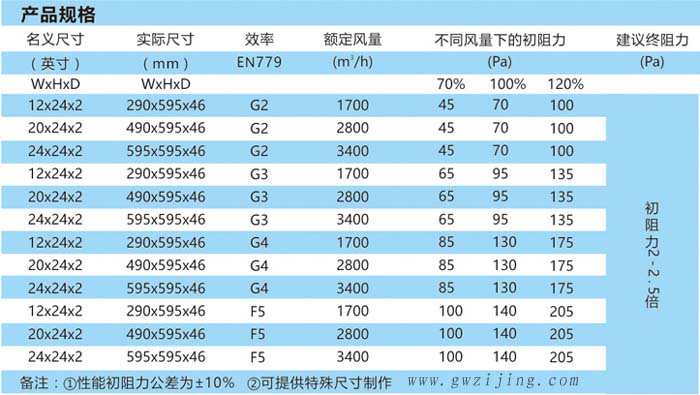G2級初效過濾器行業(yè)標準技術(shù)參數(shù):