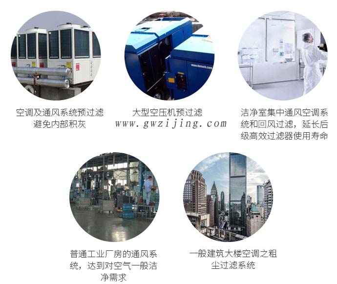 空調(diào)及通風(fēng)系統(tǒng)預(yù)過濾避免內(nèi)部積灰、大型空壓機預(yù)過濾、潔凈室集中通風(fēng)空調(diào)系統(tǒng)和回風(fēng)過濾、延長后級高效過濾器使用壽命、普通工業(yè)廠房的通風(fēng)系統(tǒng)、一般建筑大樓空調(diào)之粗塵過濾系統(tǒng)、達到對空氣一般潔凈需求。