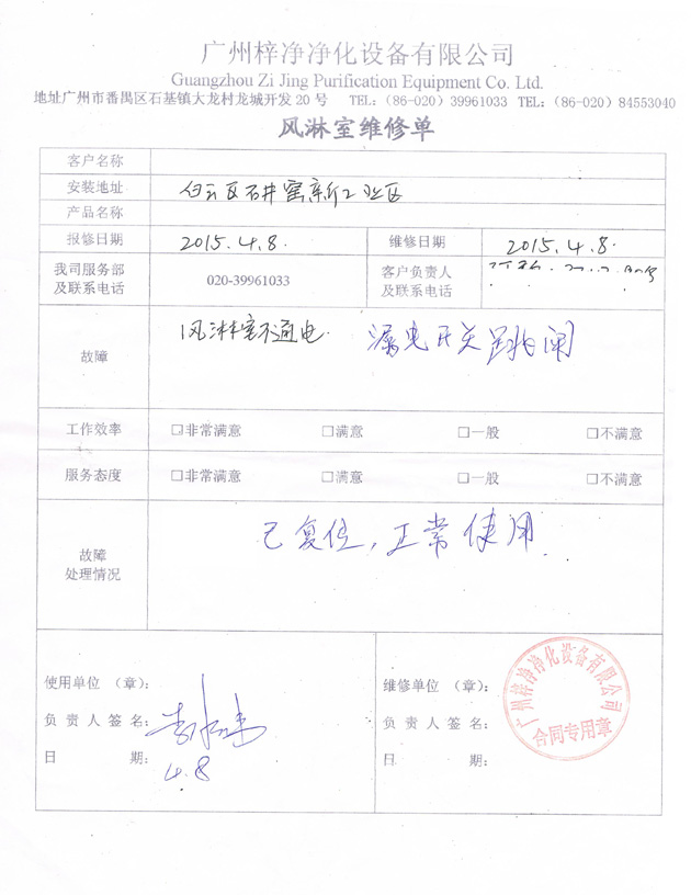 梓凈風淋室維修單主要是我司技術人員上門維修完畢和客戶確認的維修事項